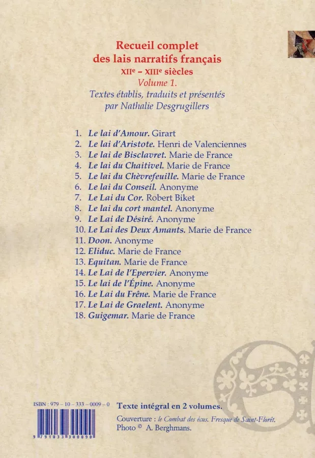 Lai d'Amour (Girart) ; Lai d'Aristote (Henri de Valenciennes) ; Lai de Bisclavret (Marie de France) ; Lai du Chaitivel (Marie de France) ; Lai du Chèvrefeuille (Marie de France) ; Lai du Conseil (anonyme) ; Lai du Cor (Robert Biket) ; Lai du Cort mantel (anonyme) ; Lai de Désiré (anonyme) ; Lai des Deux amants (Marie de France) ; Doon (anonyme) ; Eliduc (Marie de France) ; Equitan (Marie de France) ; Lai de l'Epervier (anonyme) ; Lai de l'Epine (anonyme) ; Lai du Frêne (Marie de France) ; Lai de Graelent (anonyme) ; Guigemar (Marie de France).
